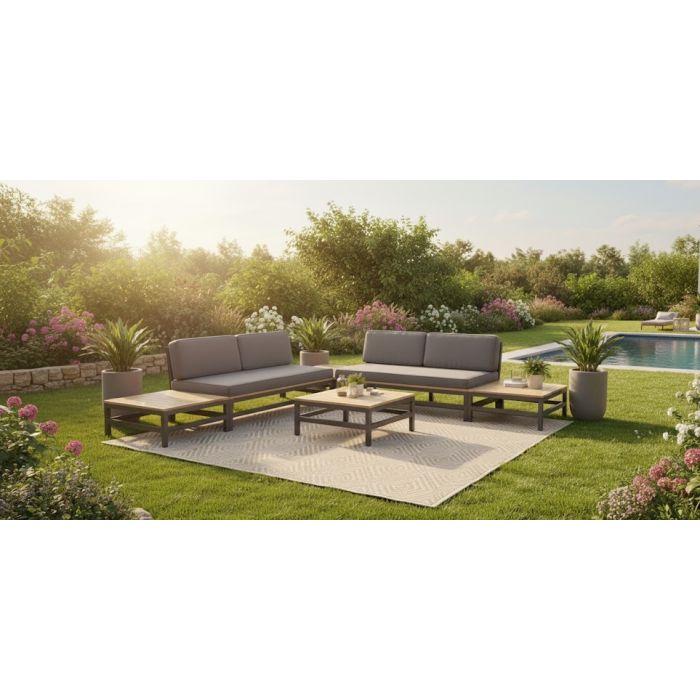 Betis lounge set 6-delig: 2 banken, 4 tafels. Aluminium gepoedercoat (anthraciet) met acacia hout in lichte teak-look. Inclusief standaard zit- en rugkussens in Royal Anthracite.