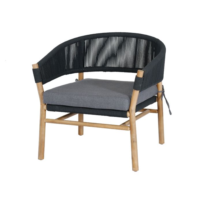 Denver Coffee Chair — aluminium frame (poedercoat anthraciet), rond koord 4,5 mm (anthraciet), acacia met lichte teak‑look; inclusief standaard zit- en rugkussen in Royal Anthracite 240