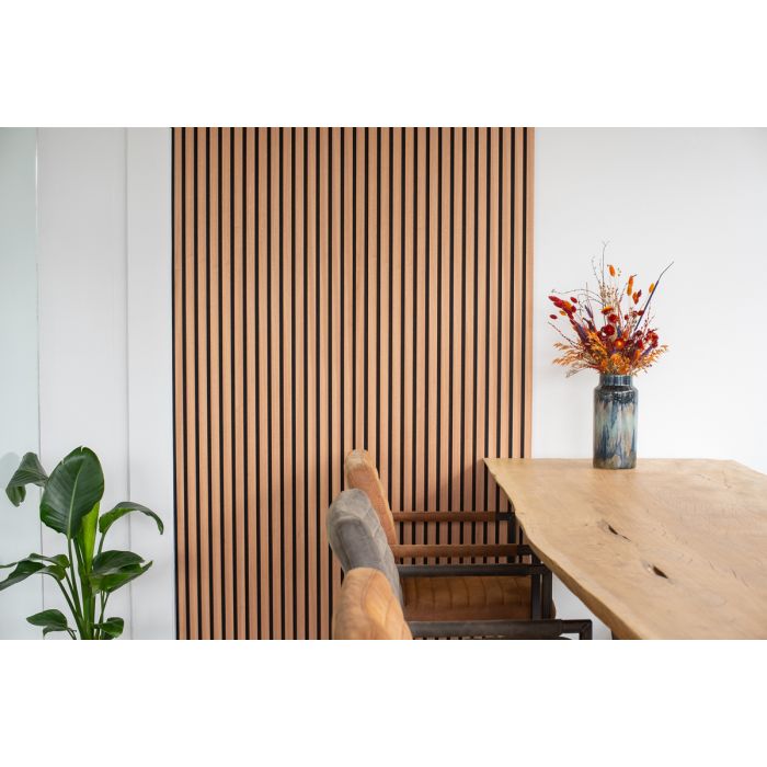 nHeb jij een woning dat voldoet aan de nieuwe bouwbesluit eisen? Zelfs dan zal het mahonie houten wandpaneel de volledig muur bedekken. De houten muurpanelen zijn gemaakt van een laag gerecycled zwart vilt met daar bovenop houten fineer lamellen met een MDF core. Het hout van de lamellen is bovendien geproduceerd door duurzame bosbouw. Hierdoor is het wandpaneel hout niet alleen een aanwinst voor het interieur, maar ook uiterst duurzaam! n n n nDaarnaast werkt de combinatie van het vilt aan de achterkant van het paneel en de lamellen geluidsabsorberend en vermindert een akupanel houten wandpaneel een galmende ruimte. Floer Akupanelen wandpanelen zijn ideaal voor iedere doe-het-zelver. De Akupanel wandpanelen hebben een consistente uitstraling en daardoor kun je ze eenvoudig naast elkaar plaatsen. Dit zorgt voor een onafgebroken en doorlopend effect. nAkupanel plaatsen