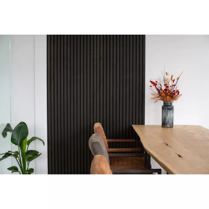 nDe achterkant van vilt op deze panelen verbetert de akoestiek in de kamer. De combinatie van vilt en de zwart geoliede houten lamellen absorbeert geluid en vermindert galm in de ruimte. Floer Akupanelen zijn bovendien ideaal voor doe-het-zelvers. Door hun consistente design kunnen de panelen gemakkelijk naast elkaar geplaatst worden, wat zorgt voor een naadloos, doorlopend effect.