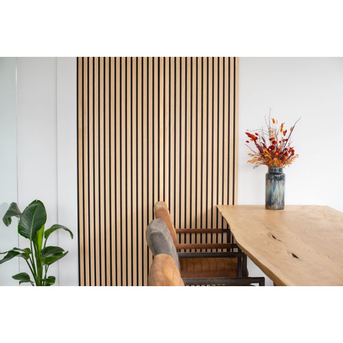 nVoldoet jouw woning aan de eisen van het nieuwe bouwbesluit? Ook dan kom je aan de bovenkant niet tekort. De houten muurpanelen zijn gemaakt van een laag gerecycled zwart vilt en houten lamellen met een MDF core. Het hout van de lamellen is bovendien afkomstig van duurzame bosbouw! Hierdoor is het wandpaneel hout niet alleen een aanwinst voor het interieur, maar ook uiterst duurzaam! n n n nDe zachte vilten achterkant zorgt voor een betere akoestiek in de ruimte. Daarnaast werkt de combinatie van het vilt en de lamellen geluidsabsorberend en vermindert het een galmende ruimte. Floer Akupanelen zijn ideale doe-het-zelf panelen. Doordat de wandpanelen een consistente uitstraling hebben kun je ze eenvoudig naast elkaar plaatsen en lijken de panelen onafgebroken door te lopen. nMonteren akupanel