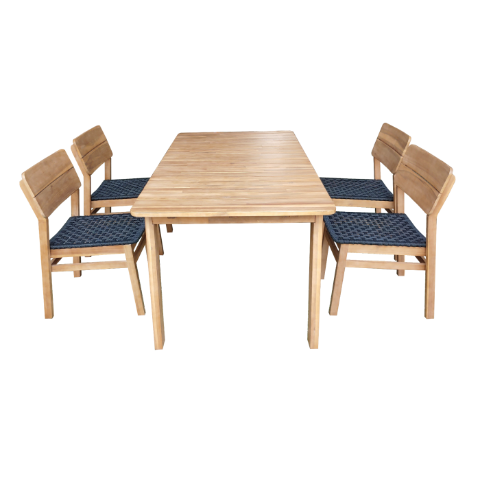 Jala tuin-eetset: tafel en vier stoelen van acaciahout in licht teak-look; stoelen met 20 mm platte antracietkleurige touwaccenten. Duurzaam, elegant en uitnodigend — ideaal voor tuin of terras.