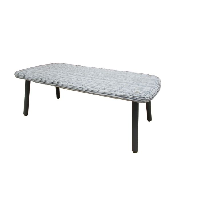 JONAH koffietafel 100×50×35 cm — staalframe antraciet/donkergrijs, rond 3 mm wicker donkergrijs en antraciet glasblad. Strak, duurzaam ontwerp voor volwassen interieurs.