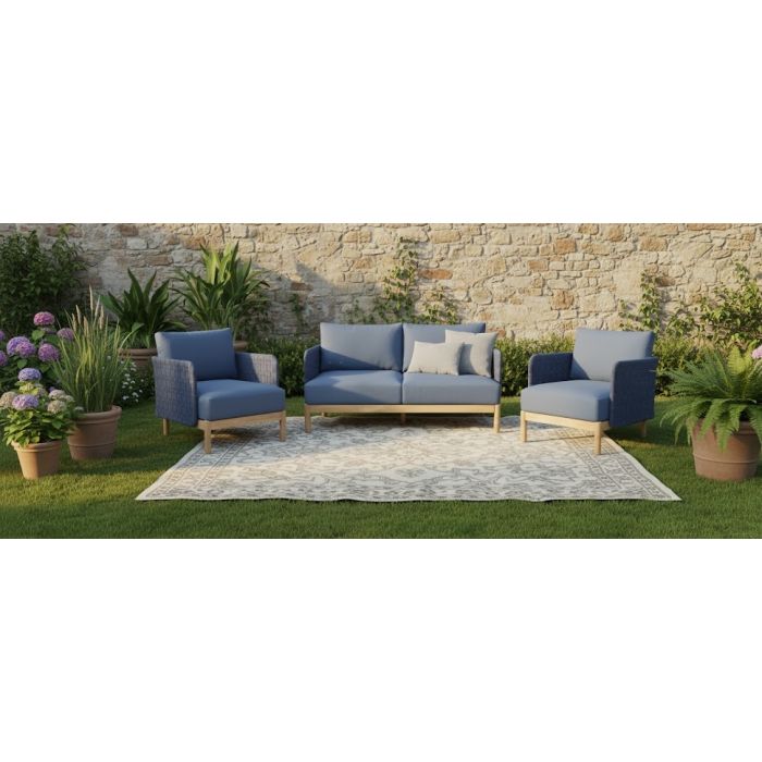 Kolbe loungeset, 3-delig: 2 stoelen en 2‑zitsbank. Stalen frame in navyblauw, 40 mm gevlochten outdoormateriaal navyblauw, acacia met lichte teak-look. Zit- en rugkussens standaard in indigo blauw (1036).
