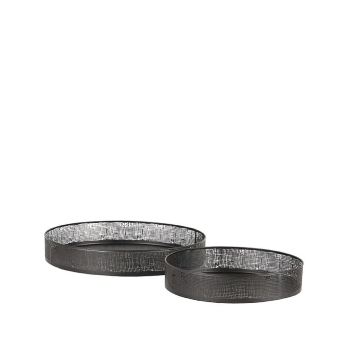 Set Dienbladen van LABEL51 in zwart metaal. Deze stijlvolle set bestaand uit twee dienbladen. De opstaande rand heeft een mooie opengewerkte structuur en is voorzien van handige handvatten. Het opengewerkte patroon is geïnspireerd op de structuur van grof geweven jute. Gebruik de dienbladen bijvoorbeeld tijdens een gezellige high tea of borrel of laat ze juist pronken als decoratie op tafel.