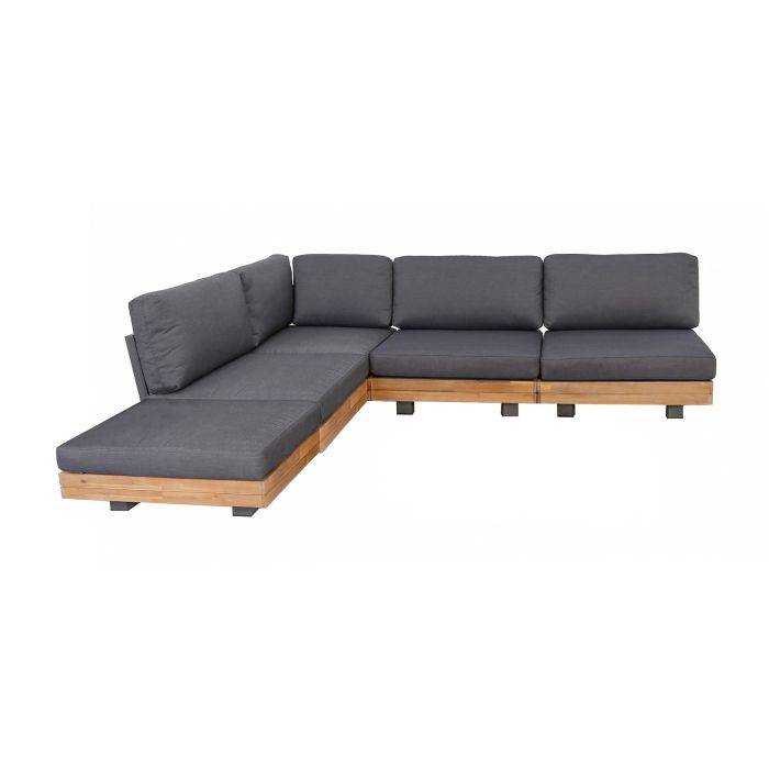 Los Angeles lounge hoekset, 5-delig (3 middenmodules, hoekmodule, hocker). Acaciahout met stalen frame (zwart), licht teaklook afwerking en donkergrijze kussens. Elegant, duurzaam ontwerp voor moderne buitenruimtes.