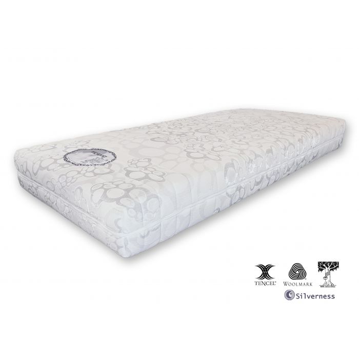 Daarnaast is de matrastijk afgewerkt met Silverness, een innovatieve behandeling met zilverdeeltjes die bijdraagt aan een hygiënisch en fris slaapoppervlak. Dit detail is zichtbaar op de detailfoto’s van het matras.
