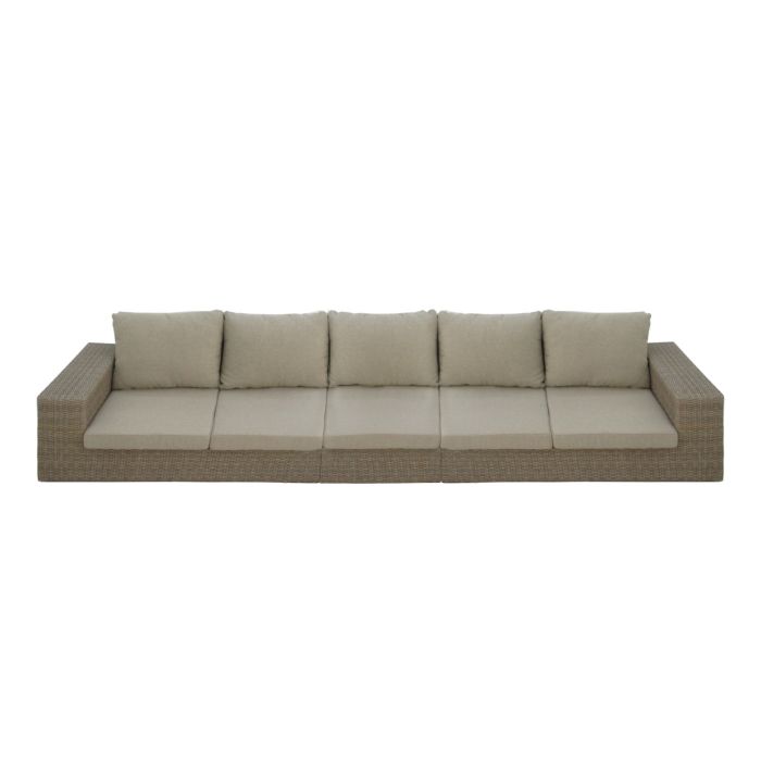Merone loungebank (links, midden, rechts) met aluminium frame (lichtgeel), 7 mm halfrond vlechtwerk (Kubu HM48), standaard zit- en rugkussens in Kubu Sand 207. Elegant, duurzaam modulair ontwerp.