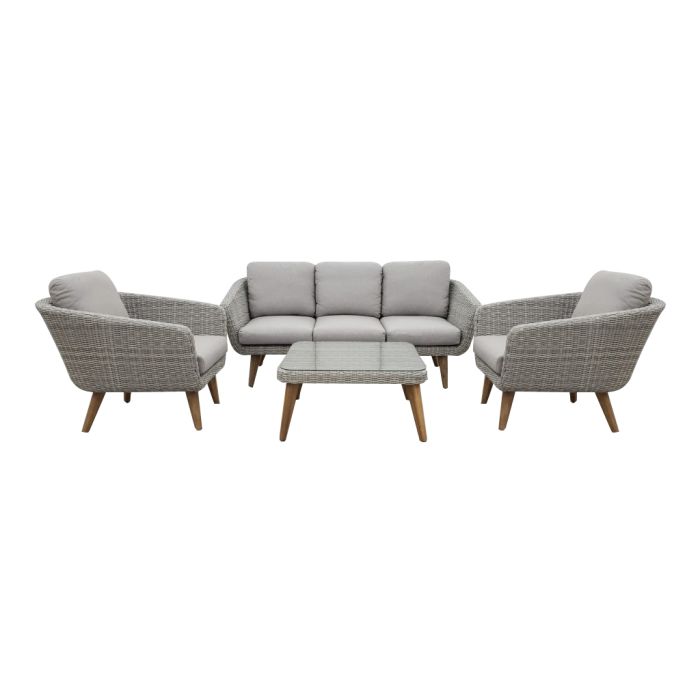 Mire loungeset (12053): aluminium frame lichtgrijs, halfround 7mm wicker in Natural White Grey, acaciahout licht teak-look, FSC 100%. Inclusief standaard zit- en rugkussens in Royal Stone Grey 240.