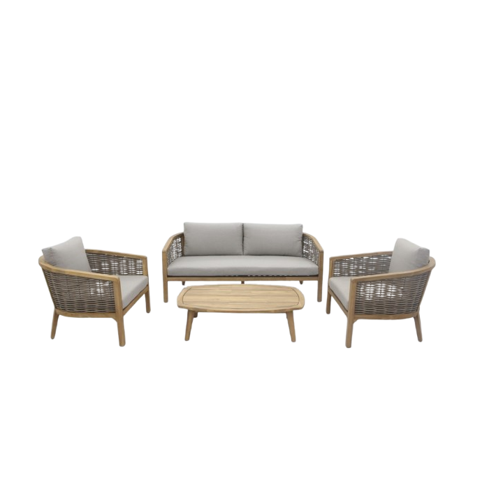 Mulhouse loungeset: 2 stoelen, 1 bank en 1 loungetafel. Aluminium frame (taupe poedercoating), rond 10mm rattan in naturel bruin, acacia met licht teak‑look. Inclusief standaard zit‑ en rugkussens in Royal Stone.