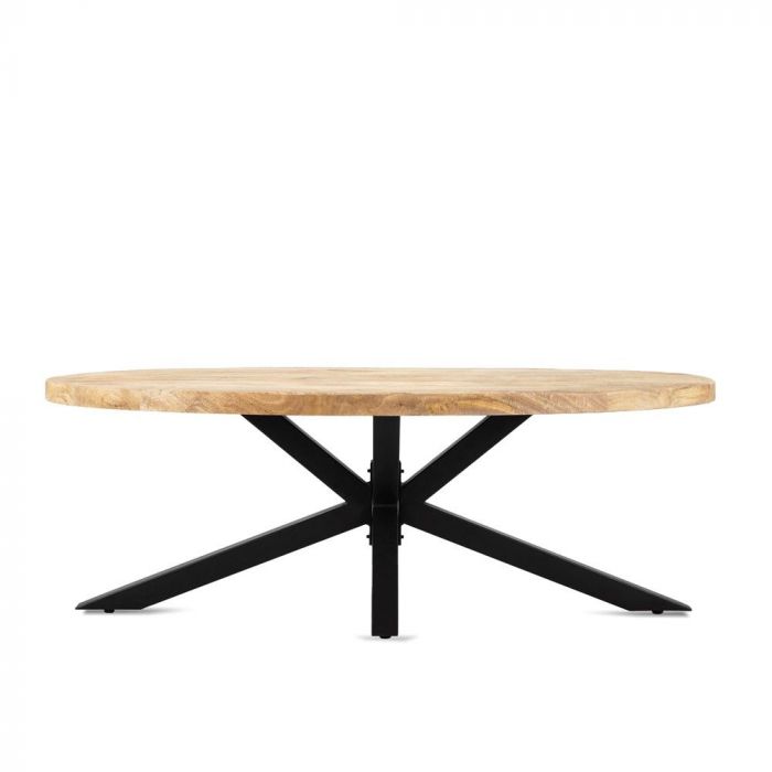 Ovale salontafel gemaakt van mangohout en een trendy matrix onderstel in het zwart. Het blad is volledig massief en van hoge kwaliteit.