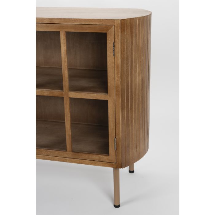 Ontdek de Yaz serie: stijlvolle dressoirs in twee hoogtes. Deze bruine rubberhouten kasten met elegante latjes en glazen deurtjes zijn perfect voor elke interieurstijl.