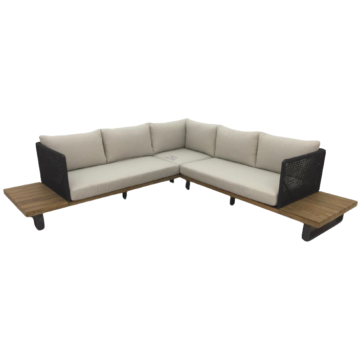 Tenerife loungeset hoek 2-delig (links/rechts). Aluminium frame antraciet, rond touw 4,5 mm antraciet, acaciahout licht teak-look. Inclusief standaard zit- en rugkussens in Royal Sand 240.