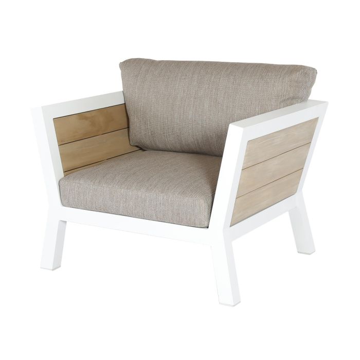 Valongo loungestoel 84,5×99×69 cm — aluminium frame wit gepoedercoat, acaciahout in licht teak-look; standaard zit- en rugkussen Serval Sand (Olefin 370).